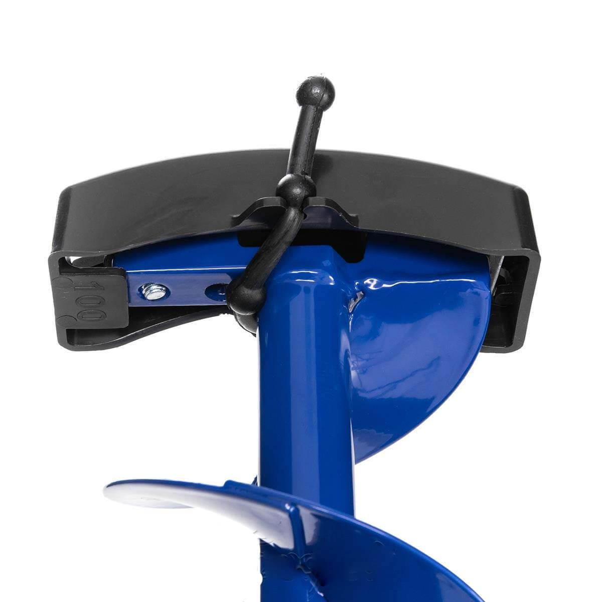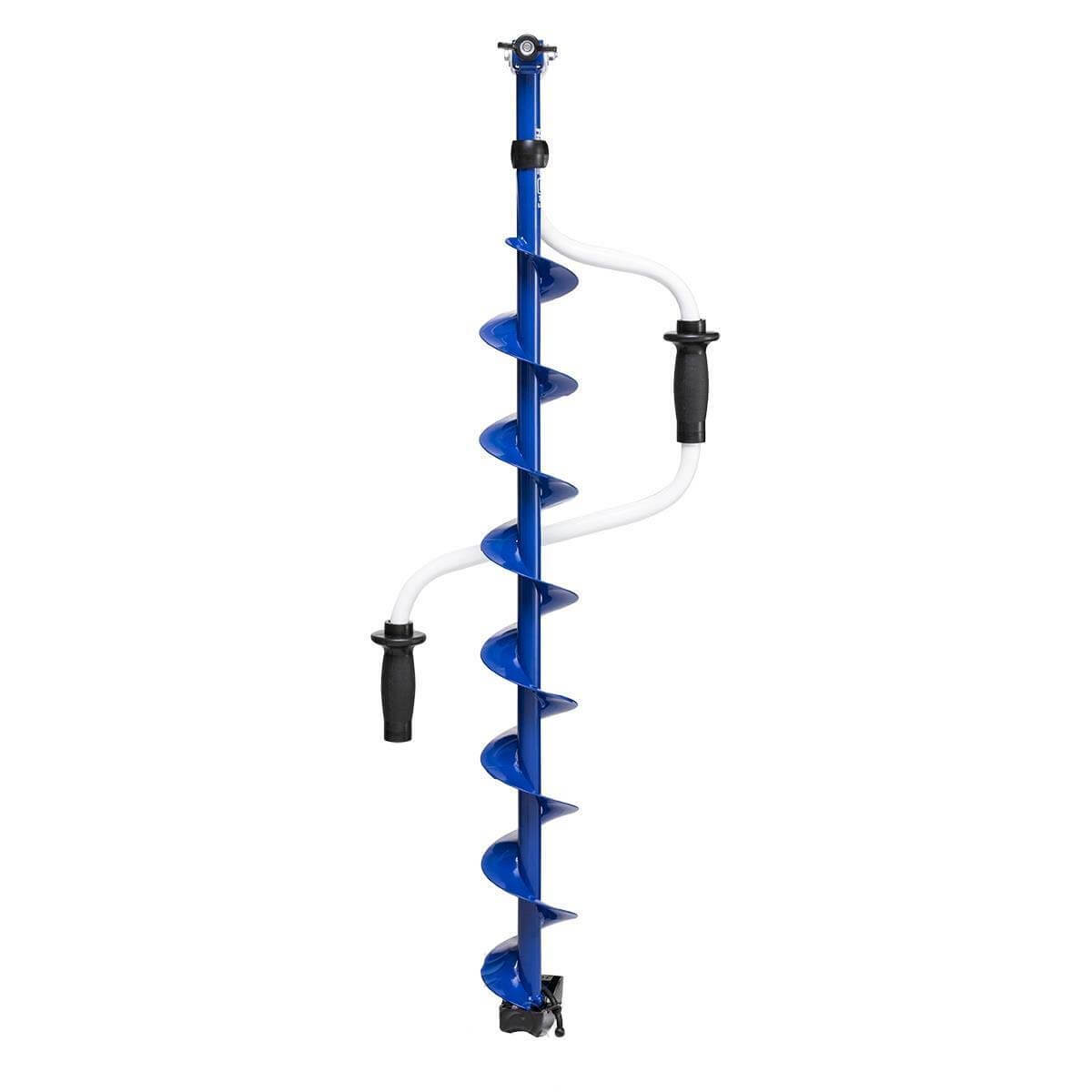 Верхняя рукоятка ледобура смещена относительно оси шнека на 130 мм, а нижняя на 150 мм. Такое расположение рукояток позволяет вращать ледобур одновременно двумя руками, тем самым, не прикладывая особых усилий, увеличивая скорость бурения лунок во льду.