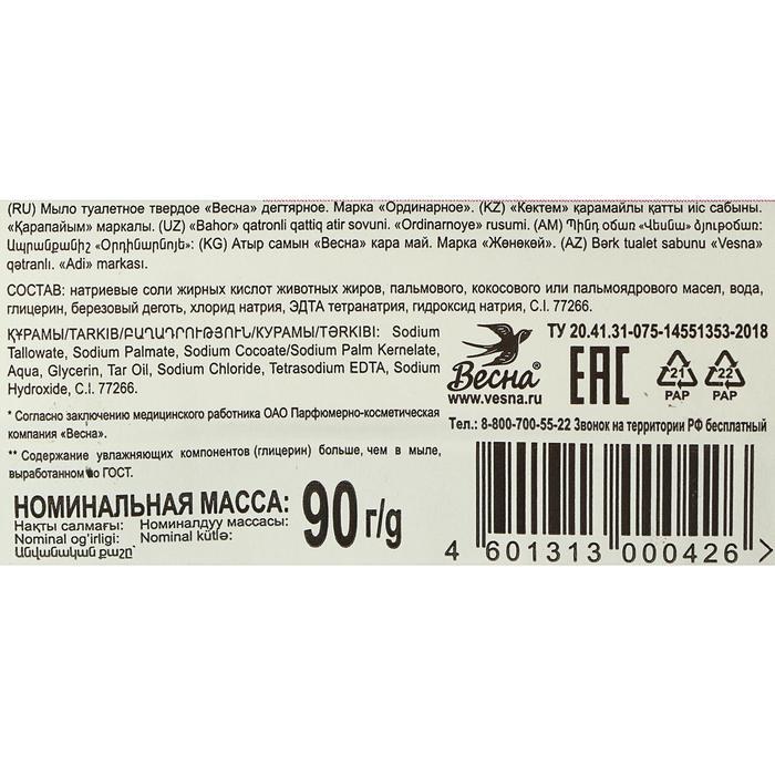 Описание: туалетное мыло Весна сочетает в себе природную пользу березового дегтя и выгоду большого формата упаковки. Твердое мыло предназначено для кожи рук, лица и тела. В дегтярном мыле присутствует слегка специфический запах, но он нежный и ненавязчивый. В состав мыла для рук входит важный компонент глицерин, позволяющий осуществить бережный уход. Мыло для лица не раздражает кожу и устраняет жирный блеск. Твердое мыло для рук мягко очищает кожу, не сушит и не стягивает ее. Туалетное мыло для лица рекомендуется людям с жирной и проблемной кожей, т.к. дегтярное мыло тщательно очищает и избавляет от прыщей. После применения мыла для тела необходимо нанести увлажняющее средство. Дегтярное мыло Весна убирает высыпания на спине, плечах, поэтому его можно использовать для профилактики кожных заболеваний. Туалетное мыло для рук может применяться для умывания лица, для тела, для ванночек ног. Также мыло подходит для мытья внутренних поверхностей обуви, для стирки белья и для домашних животных.