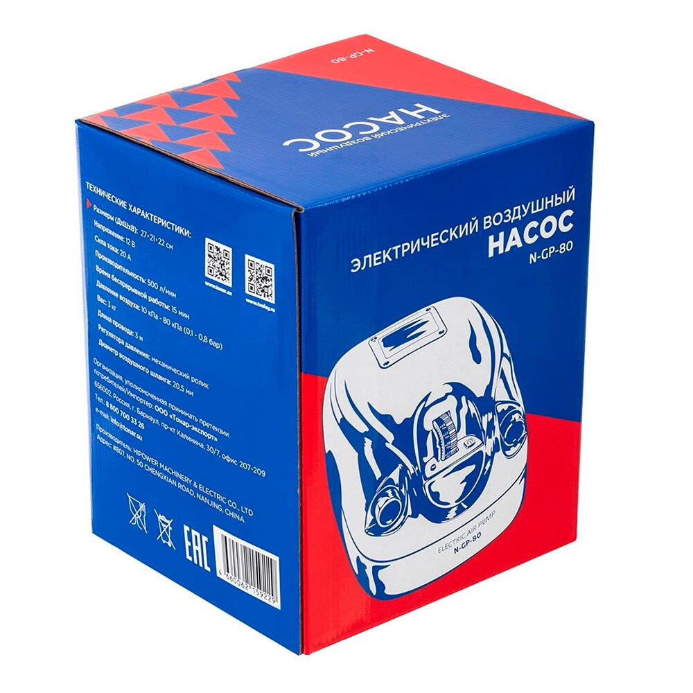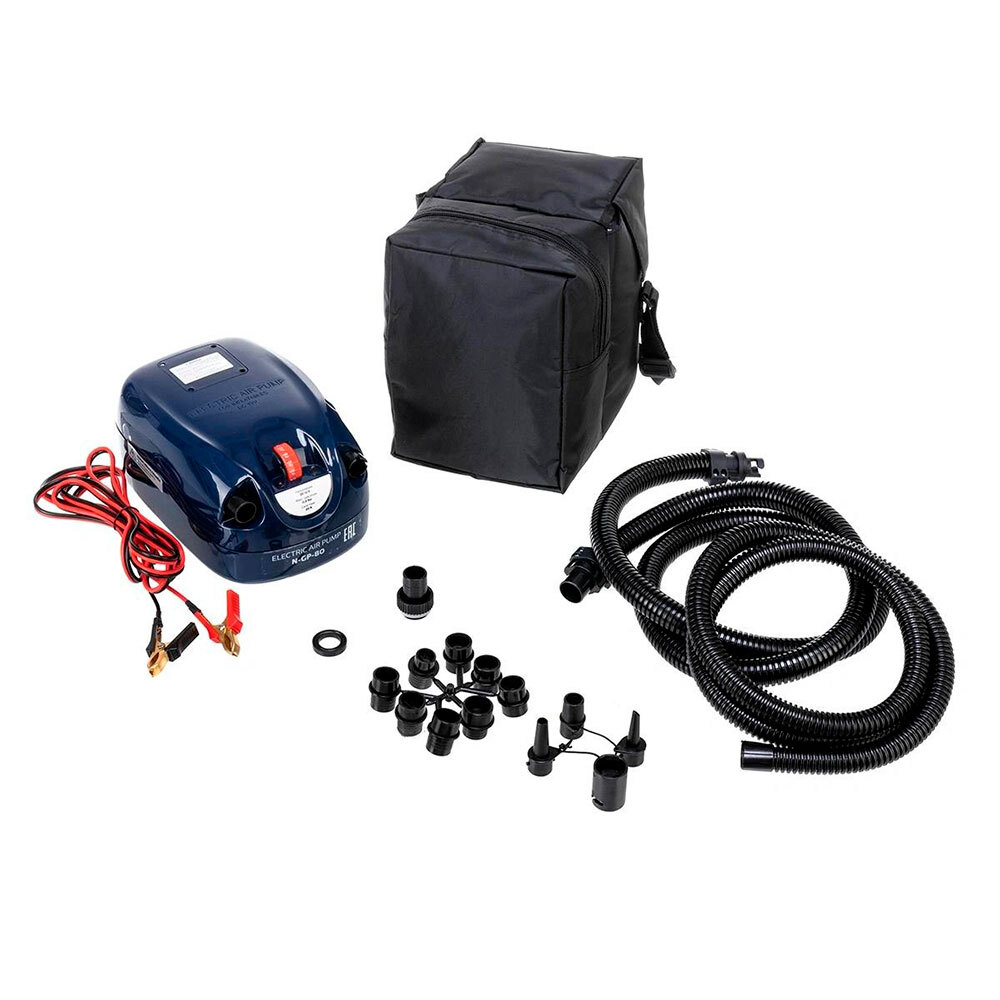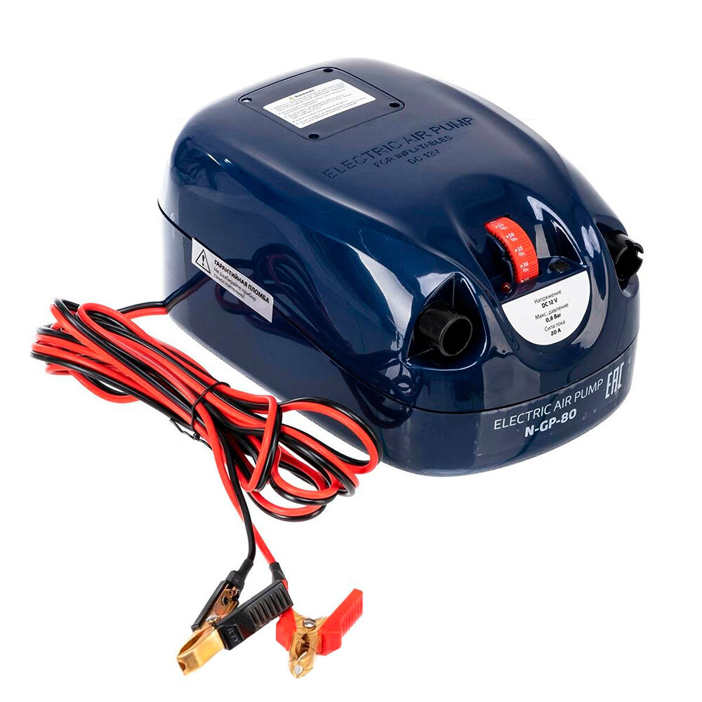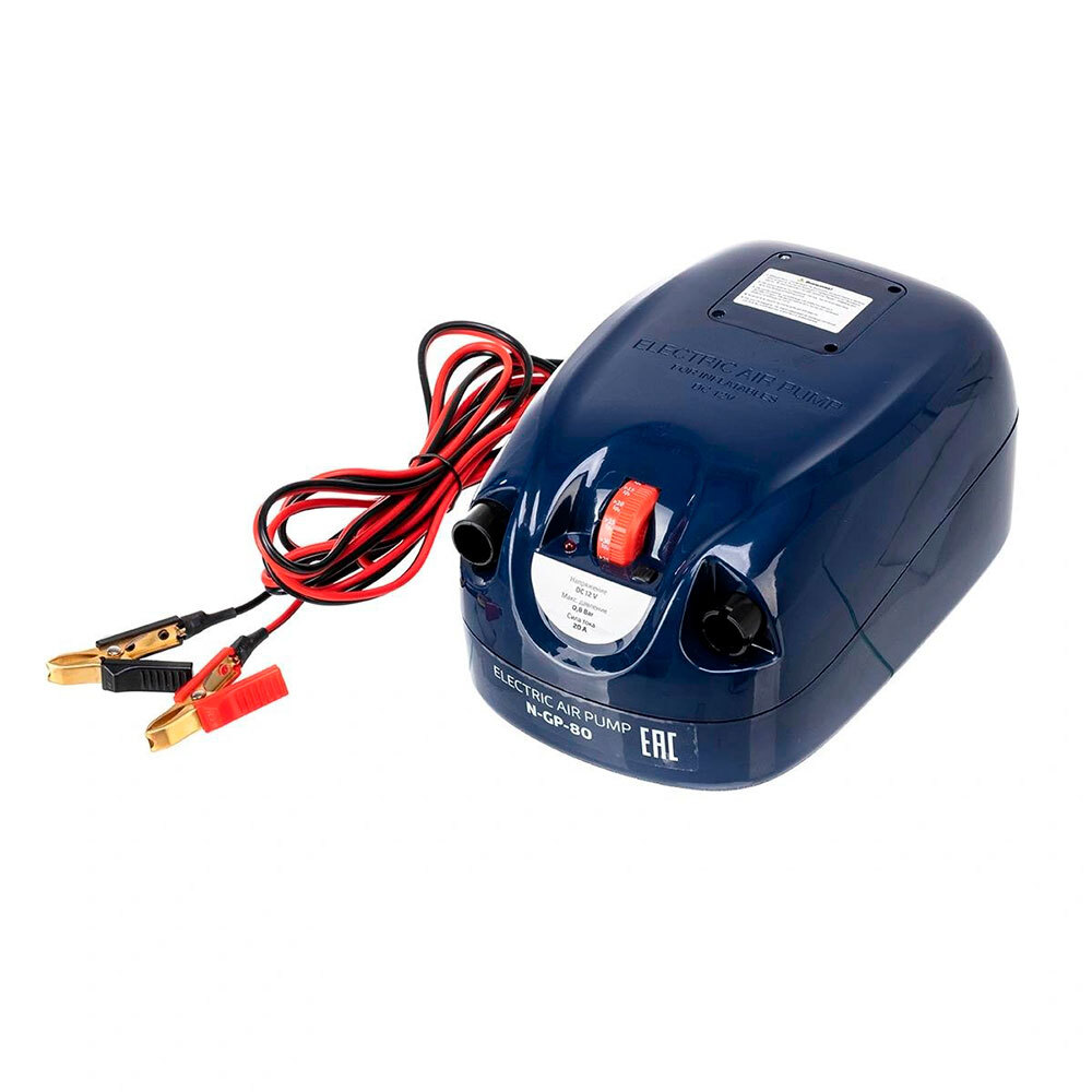 Двухступенчатый электрический насос высокого давления N-GP-80 работает только от внешнего аккумулятора 12 В. Регулятор давления – механический в диапазоне 0,1÷0,8 Bar с шагом 0, 05 Bar. Подходит для накачивания/сдувания надувных лодок ПВХ, РИБов, бассейнов, матрасов, аттракционов (в комплекте поставки – адаптер под вворачиваемый клапан и 9 переходников под воздушные клапаны различных диаметров).
