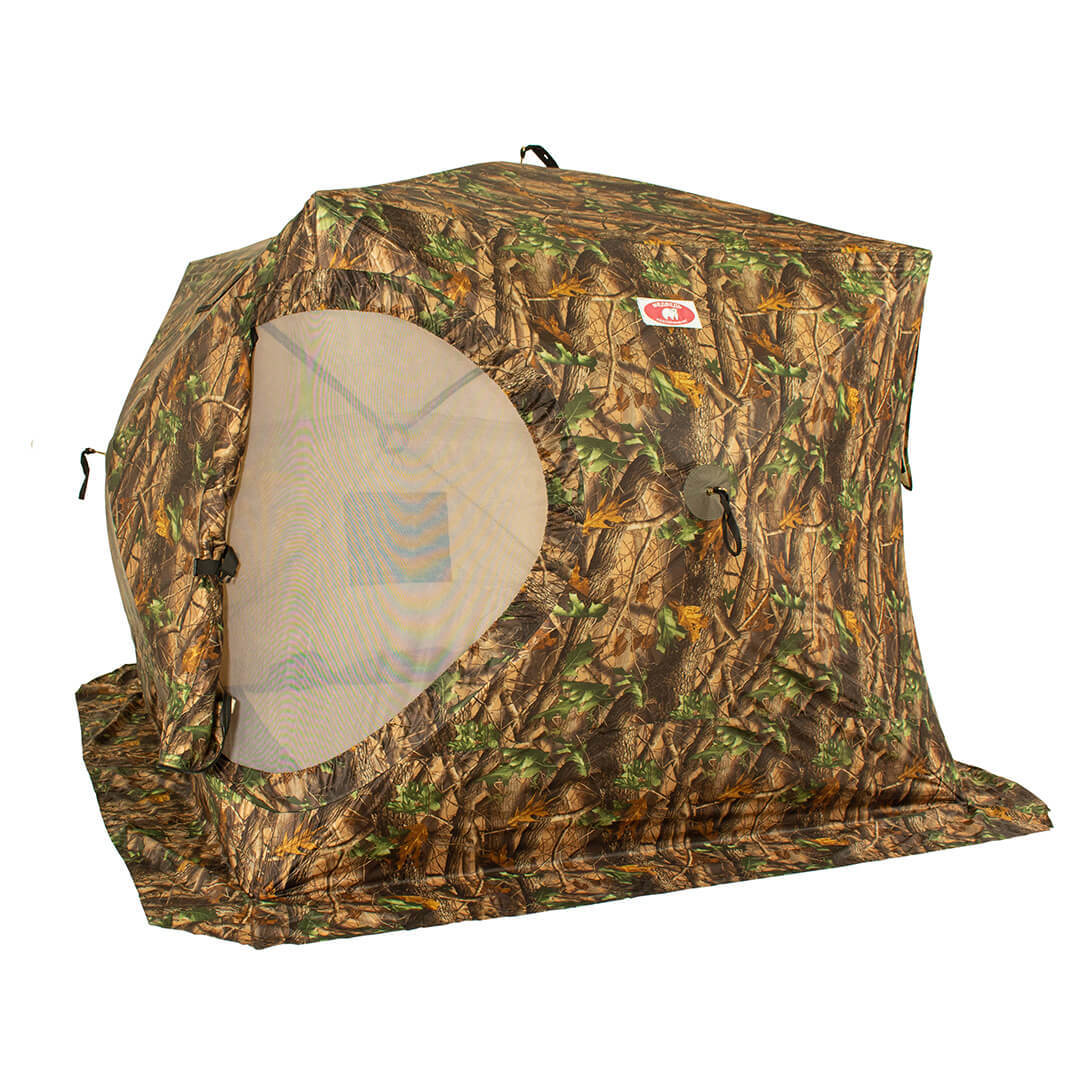 Модель снабжена ветро/снегозащитной юбкой (25 см), двумя большими окнами с москитной сеткой, окном на липучке с дополнительной вставкой под трубу, нижним окном приточки воздуха. К палатке прилагается чехол для переноски и хранения.