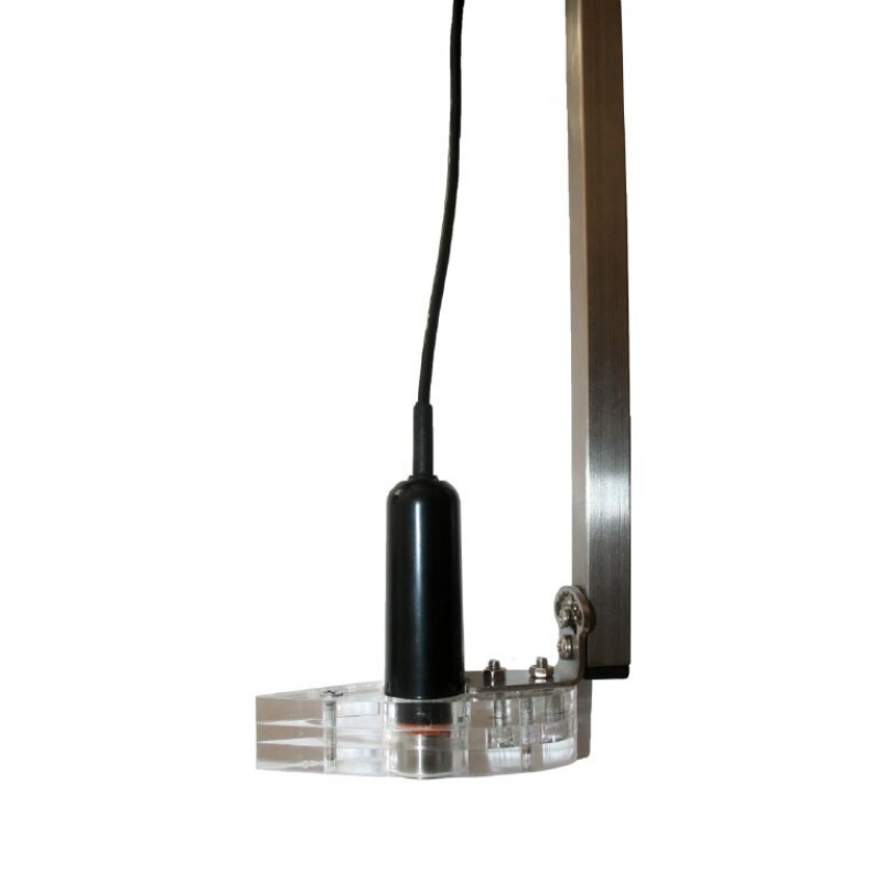 Крепление к лодке имеет регулируемый поворотный механизм с углом до 900 , что позволяет поднять датчик из воды во время перехода на большой скорости с одного места исследования водоема на другое, не снимая всю струбцину с лодки.