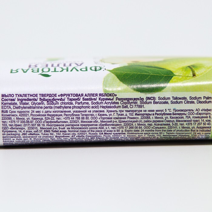 Состав: натриевые соли натуральных жирных кислот, вода, парфюмерная композиция, стабилизатор, пластификатор, вещества отбеливающие.