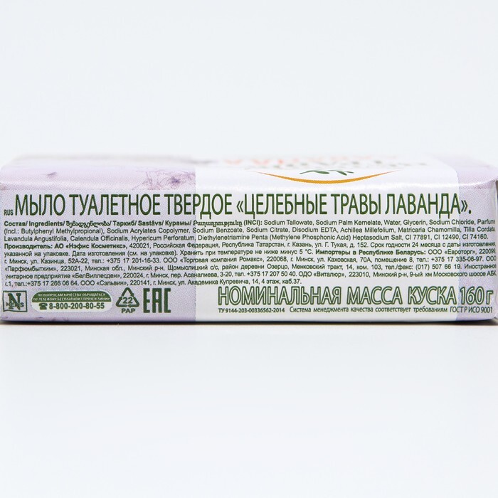 Мыло туалетное кусковое Целебные травы с весенним ароматом Лаванды. В составе комплекса 'Целебные травы' - активные органические экстракты лекарственных растений, а также специально разработанный научным институтом сбор пяти трав. При производстве косметики используются натуральные природные ингредиенты.