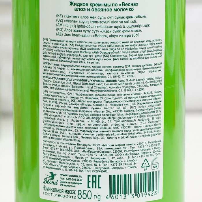 Жидкое крем-мыло ВЕСНА Ассорти Алоэ и овсянное молочко 850гр 7752682