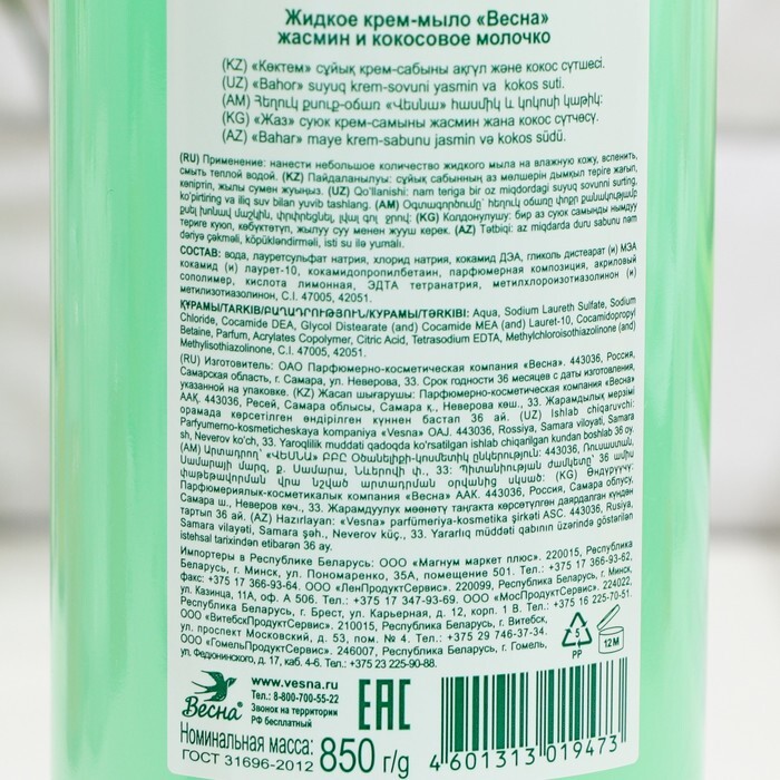 Жидкое крем-мыло ВЕСНА Ассорти Жасмин и кокосовое молочко 850гр 7752684